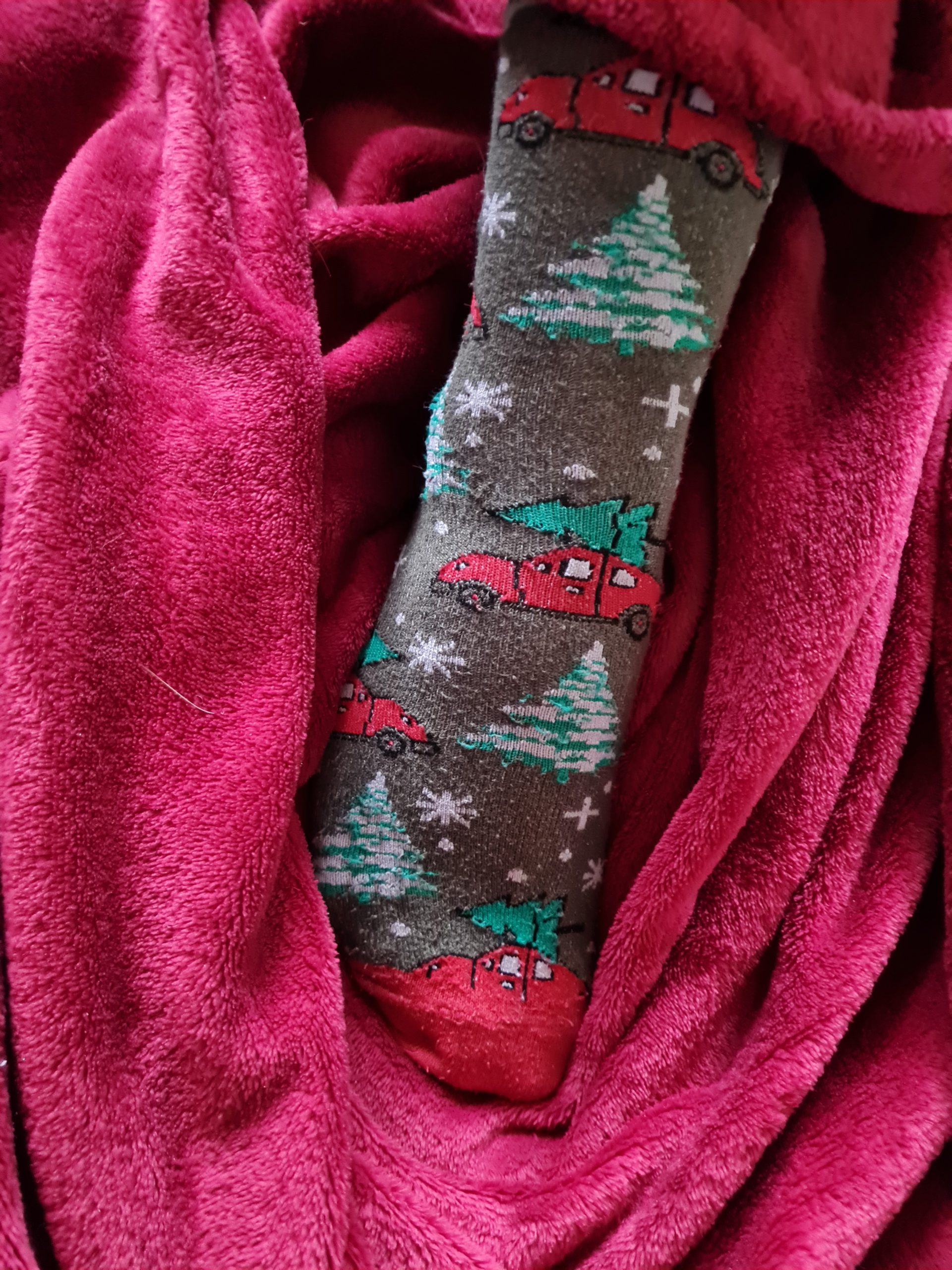 Anlässlich der Feiertage verkaufen wir ein paar Weihnachtssocken, getragen im alltäglichen Weihnachtsstress. Trägerin ist 23 Jahre alt.